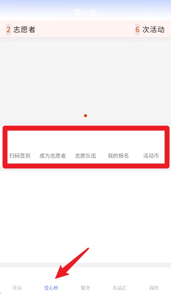 2、爱心桥页面提供志愿服务入口,可扫码签到、报名活动、兑换活动币等功能,便于志愿者日常操作。