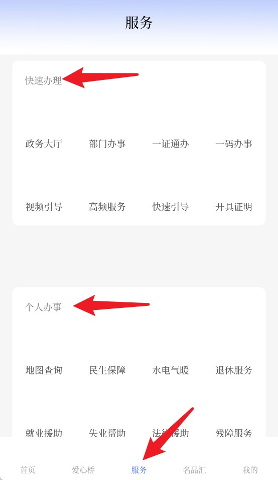 3、服务页面整合政务与个人事务办理功能,涵盖民生保障、法律援助、水电气暖等便捷服务入口。