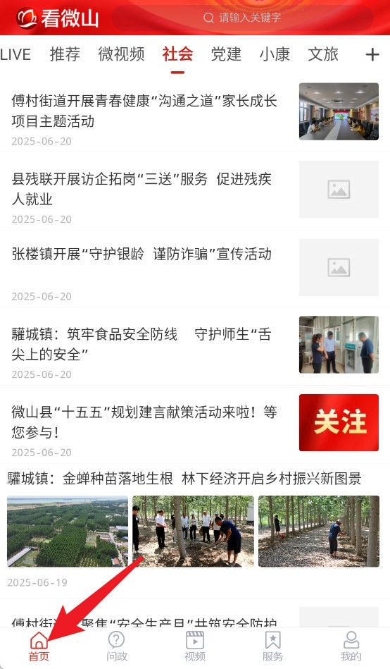 1、点击底部“首页”可查看推荐内容、最新资讯和各类社会热点新闻更新。
