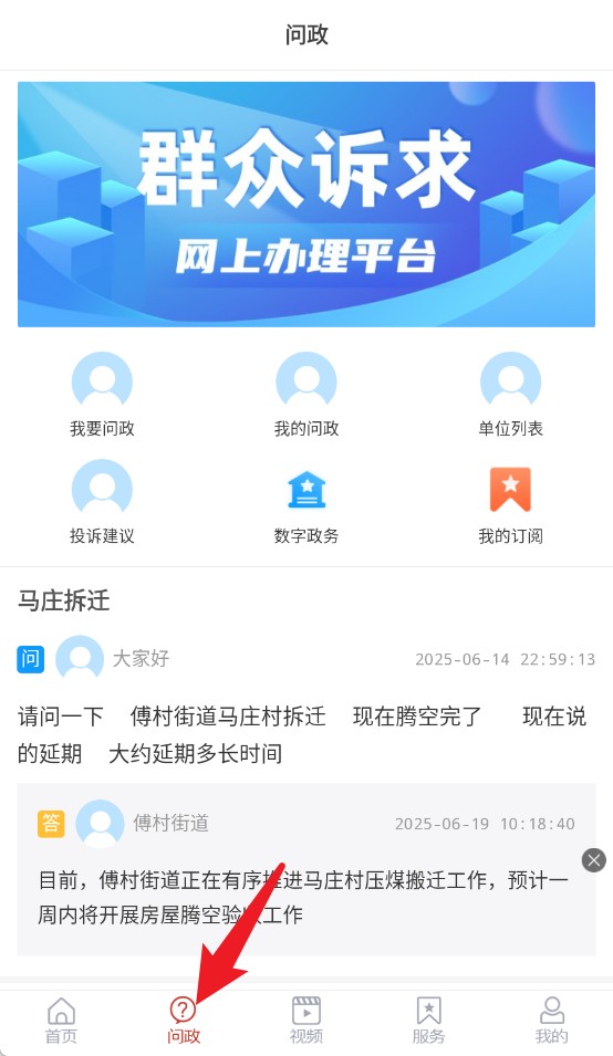 2、进入“问政”板块可在线提交诉求,查看我的问政、单位列表和处理进度。