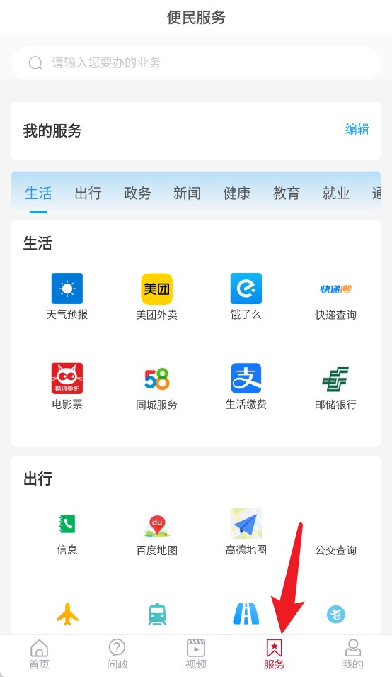 4、点击“服务”进入便民服务平台,可查天气、快递、外卖、地图等常用工具。