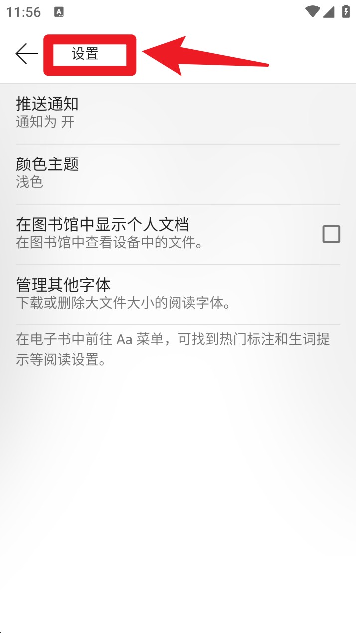 5. 在「设置」页面中可调整通知推送、颜色主题、文档显示方式及字体管理,支持自定义阅读体验,适配不同阅读习惯与需求。