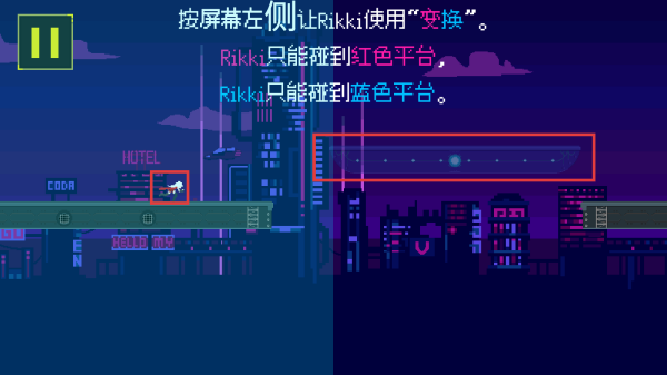 2、点击屏幕左侧可以变换角色,红色的Rikki只能碰到红色平台,蓝色的Rikki只能碰到蓝色平台。