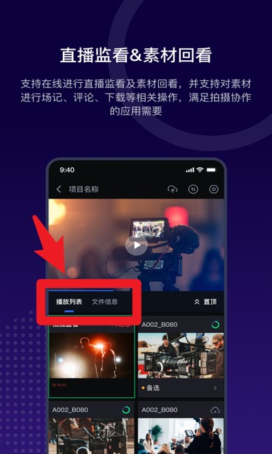 支持将拍摄设备的拍摄素材自动上传至云端,在线回看已录制的素材并对素材进行场记、质量评价等操作。