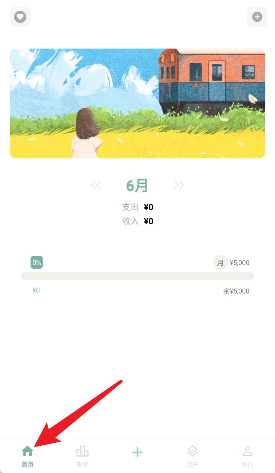 1.点击底部“首页”按钮,可查看当月收支情况、预算进度及图文封面,掌握财务动态。