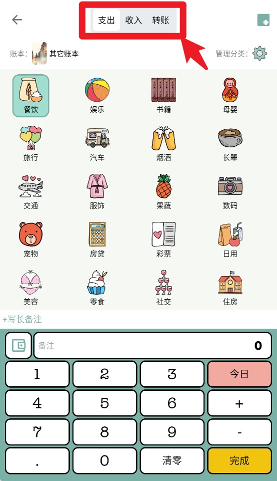 3.点击中间“+”按钮添加记账,选择支出、收入或转账类型,并从图标中选择分类记录。