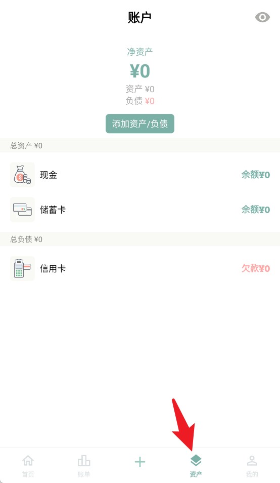 4.点击“资产”按钮可添加和管理现金、银行卡、信用卡等资产信息,查看净资产情况。