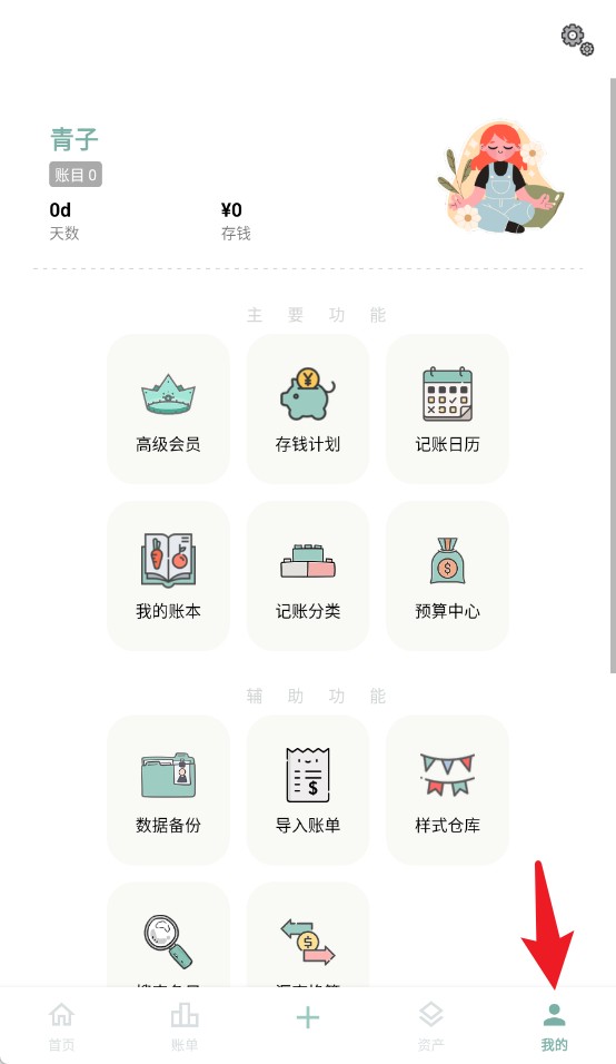 5.点击“我的”页面可进入个人中心,查看账户、预算、日历、备份等多个实用功能入口。