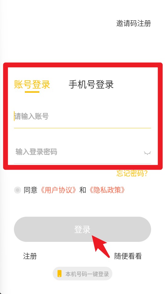 1、打开应用进入登录界面,支持账号和手机号两种登录方式,输入信息后点击下方“登录”按钮完成登录。