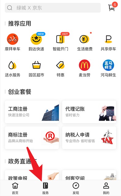 3、点击底部“服务”按钮,进入综合服务页面,可查看推荐应用和创业套餐等便捷功能模块。