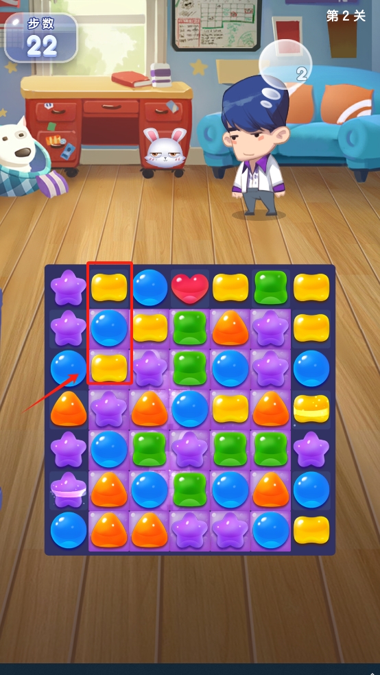 2、通过交换相邻方块完成三连消除,达成消除目标。