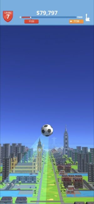 1、点击足球,开始游戏,注意右上角显示当前金钱,左下角可升级角色属性。