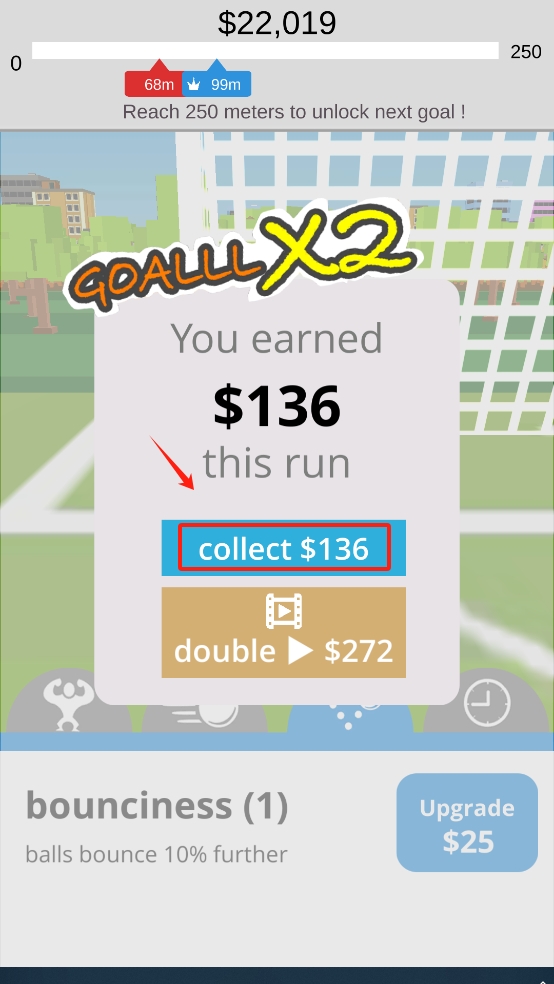 2、成功进球后,点击 “collect $136” 收集奖励,还可选择翻倍奖励。