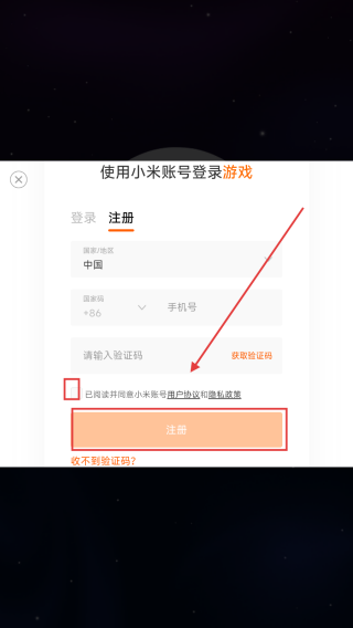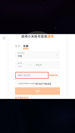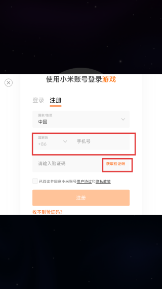 1、打开注册界面,输入【手机号】后,点击【获取验证码】。