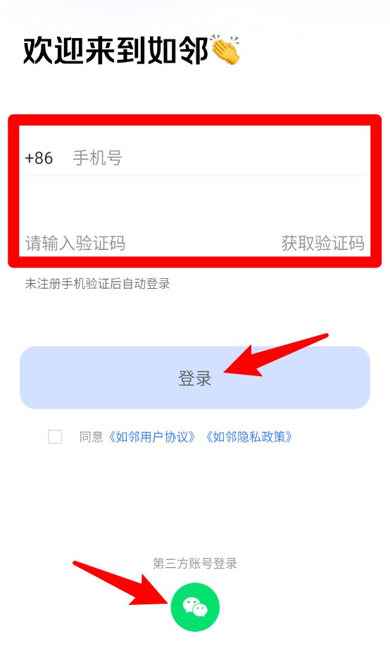 1、如邻App支持手机号验证码或微信登录方式,填写信息后点击“登录”按钮即可进入。