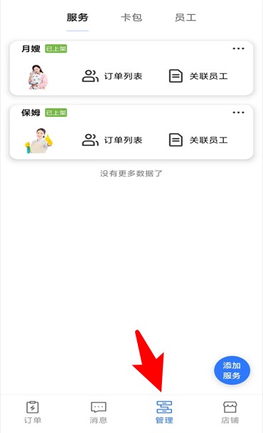 2、登录后进入服务管理页面,可查看现有服务内容与员工信息,点击下方“管理”选项进行操作。