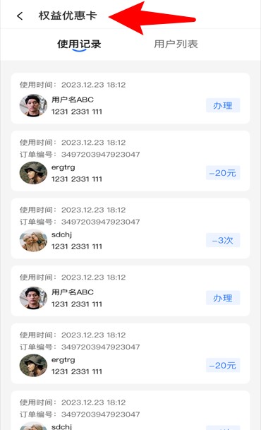 4、在“权益优惠卡”页面可查看使用记录与用户详情,包括优惠金额与处理状态等。