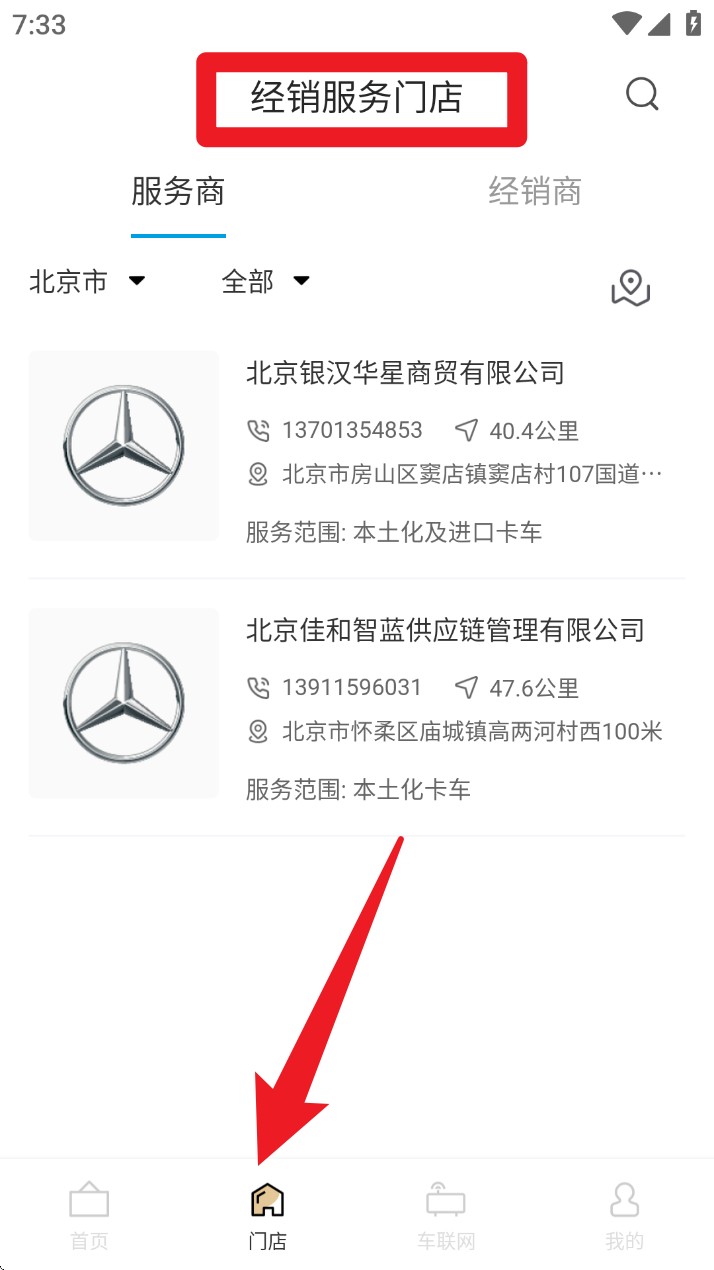 2. 切换至底部菜单栏的「门店」,可浏览附近经销服务商门店信息,支持查看服务范围、地址电话,并可直接导航前往。