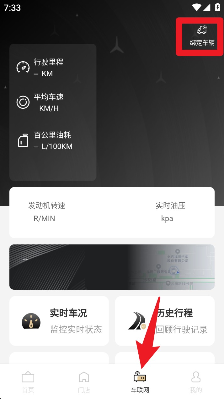 3. 在「车联网」页面点击右上角「绑定车辆」,即可同步查看行驶里程、油耗等实时数据,帮助你掌握车辆状态。