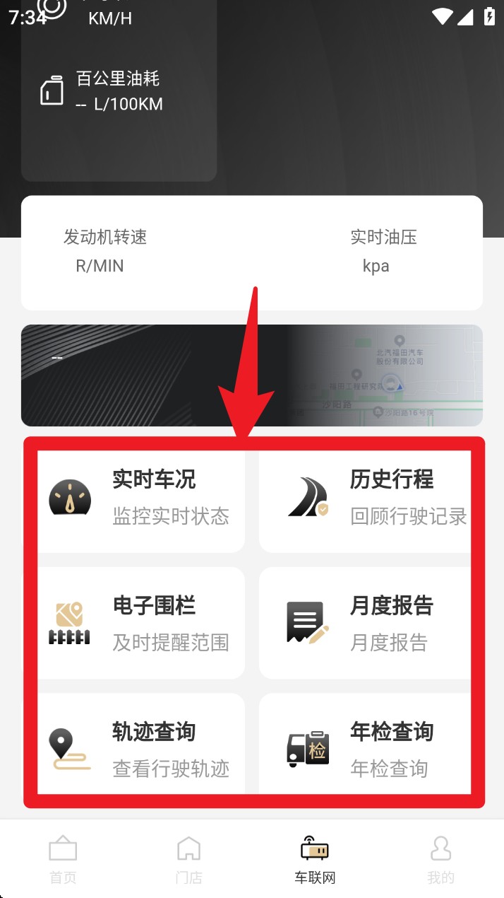 4. 车联网页面下方还能进入实时车况、轨迹查询、电子围栏等模块,支持查看历史行程、生成月报及年检状态。