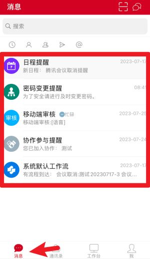 1、点击底部“消息”按钮可查看包括日程提醒、协作参与、密码变更等在内的各类系统通知信息。