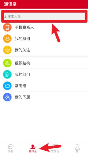 2、在“通讯录”页面中可以通过关键词搜索人员,并快速访问组织结构、我的群组及常用联系人列表。
