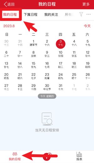 3、打开“我的日程”界面后可通过日历视图查看每日安排,并支持查看下属与关注对象的日程计划。