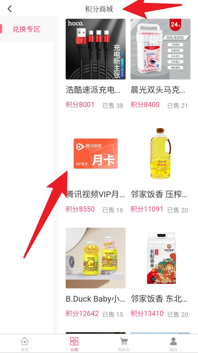 3. 打开底部「云商城」进入积分商城,可使用积分兑换VIP会员、家用好物、文具或食品等实用商品。