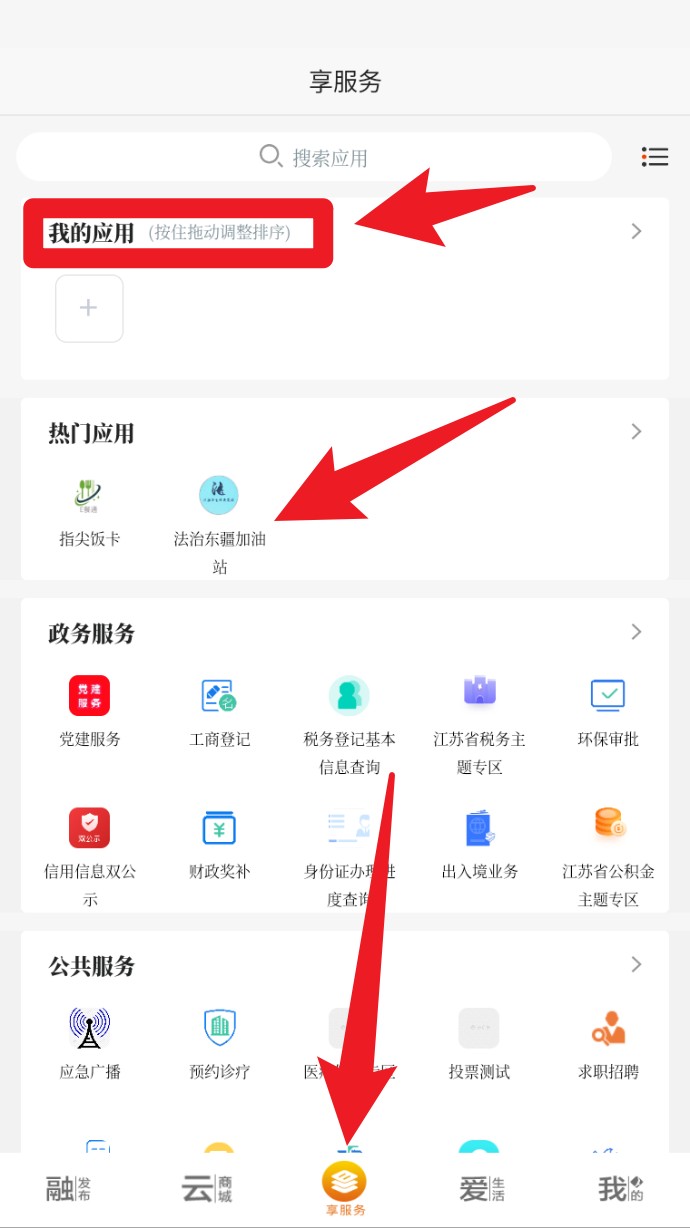4. 切换到底部「享服务」页面,可添加常用功能,快速访问政务、证件查询、医疗挂号等生活服务。