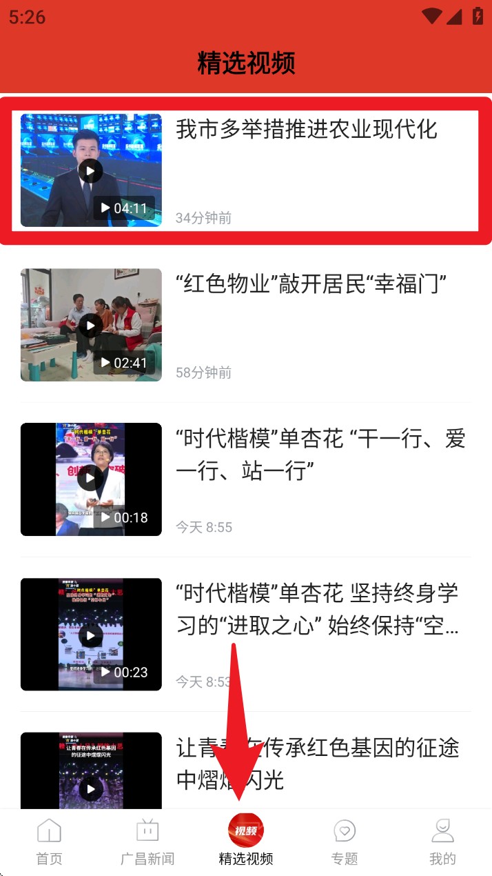 3. 切换至「精选视频」栏目,浏览各类短视频内容,包括民生动态、地方发展与人物专题等,点击播放即可观看。