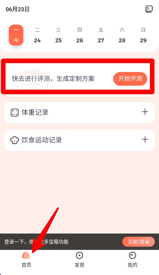 2、首页可进行身体评估并记录体重与饮食,方便生成个性化健康计划方案。