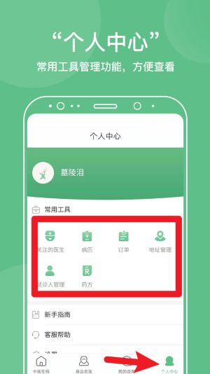 1、进入“个人中心”页面后可查看常用工具栏,包含病历、订单、药方等功能方便统一管理。