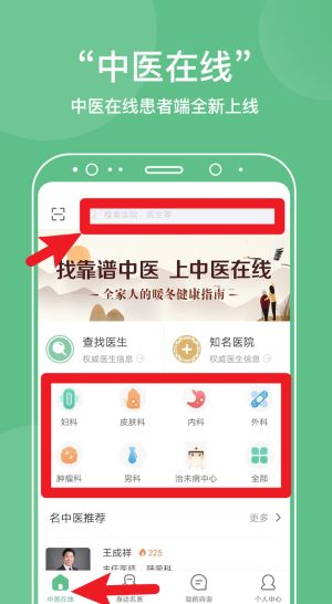 2、在“中医在线”页面中可搜索医院或医生,按科室快速分类,便于用户选择合适的中医服务。