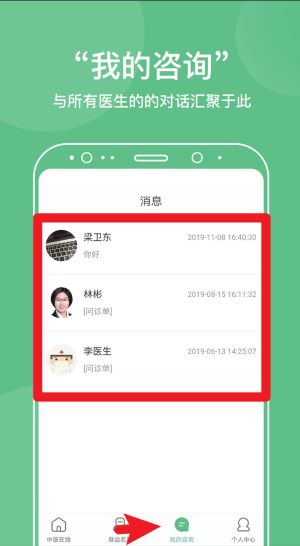3、点击“我的咨询”可查看与医生的历史对话记录,所有消息集中展示便于快速查阅与跟进。