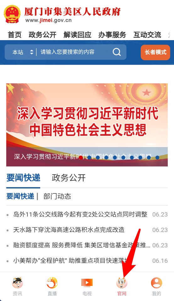 4、点击“官网”按钮可跳转至集美区人民政府官网,浏览政务信息与公告详情。