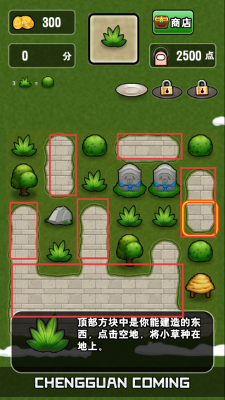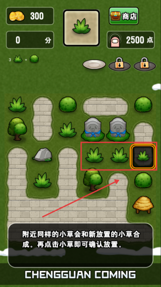 2、三个相同的植物相邻时,点击可以合成下一级的植物。
