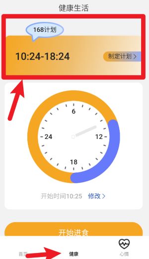 3、进入“健康”模块后,可设置168间歇性断食计划,明确每日进食与禁食时间段。