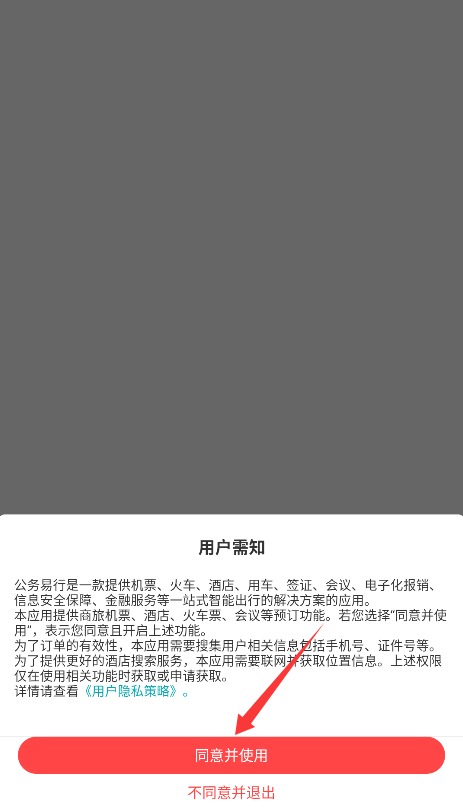 1、初次使用需完整阅读平台服务条款与隐私政策,确认后点击同意并使用进入应用。