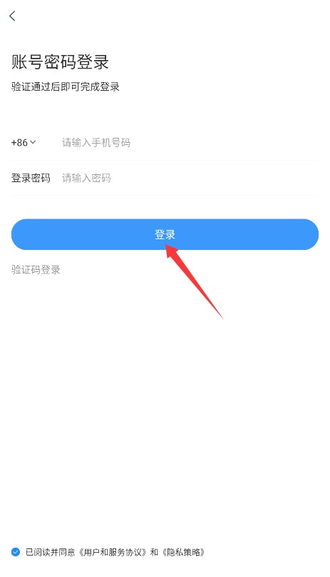 3、输入注册手机号和对应密码,勾选同意协议后点击"登录"按钮完成账号认证。