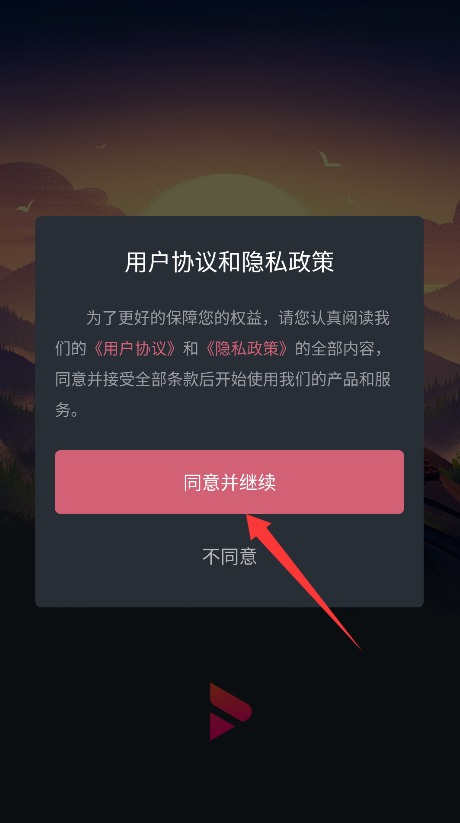 1、初次使用需完整阅读平台服务条款与隐私政策,确认后点击同意并继续进入应用。