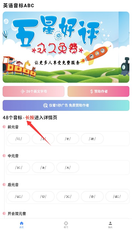 2、在首页选择48个音标中的任意一个,长按即可进入该音标的详细学习页面。