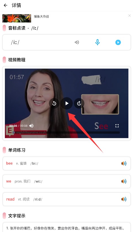 3、点击音标可播放发音,点击播放按钮还能观看视频教程学习发音技巧和相关单词。
