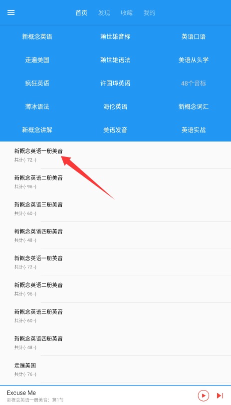 3、进入应用首页后,可根据学习需求选择相应的英语课程内容,点击后系统将自动播放课程音频开始学习。