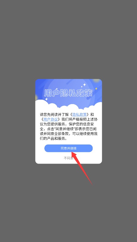 1、初次使用需完整阅读平台服务条款与隐私政策,确认后点击同意并继续进入应用。