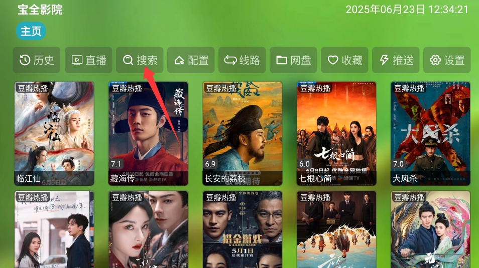 2、首页采用瀑布流展示内容,遥控器方向键即可快速浏览。语音搜索功能支持片名、演员等多维度查找。
