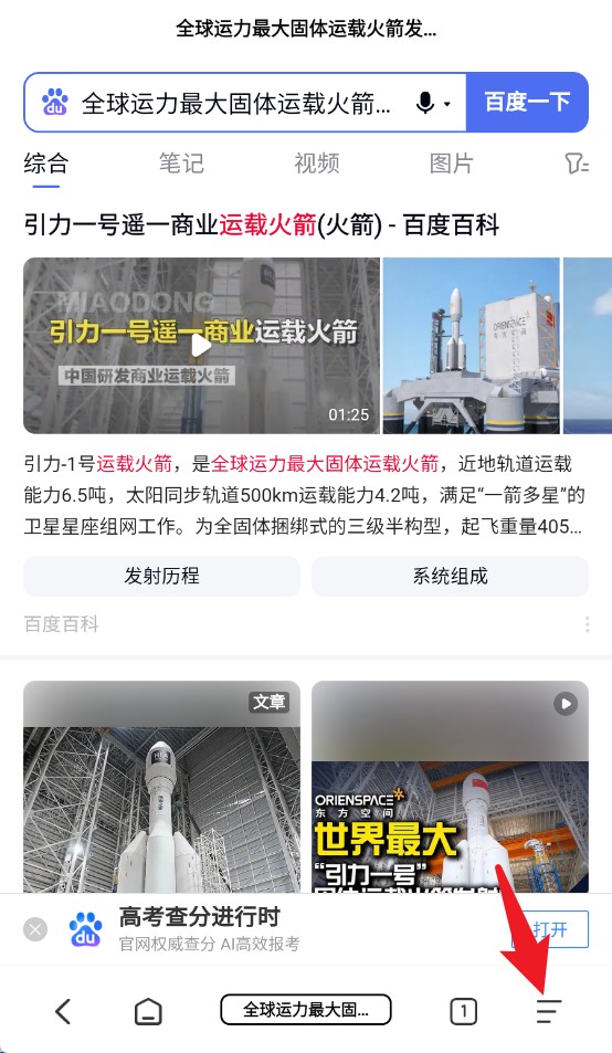 2、输入关键词“全球运力最大固体运载火箭发射成功”并点击搜索按钮,开始检索信息。