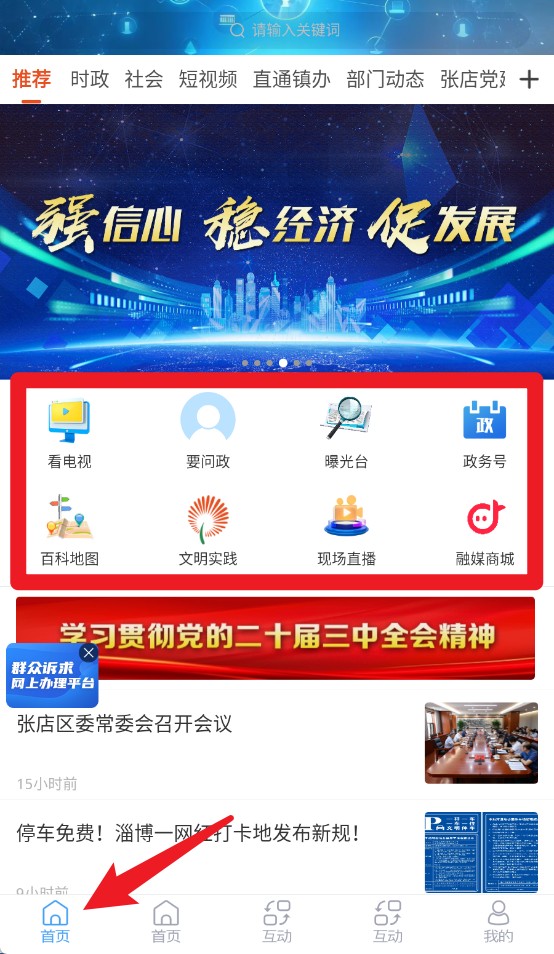 1.首页模块集成政务、地图、电视、曝光台等功能入口,方便用户快速访问重要本地信息服务。