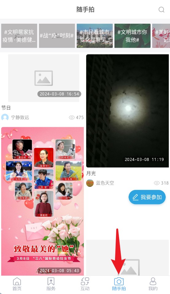 4.随手拍功能鼓励用户参与城市建设建议与创意展示,增强市民互动与归属感。