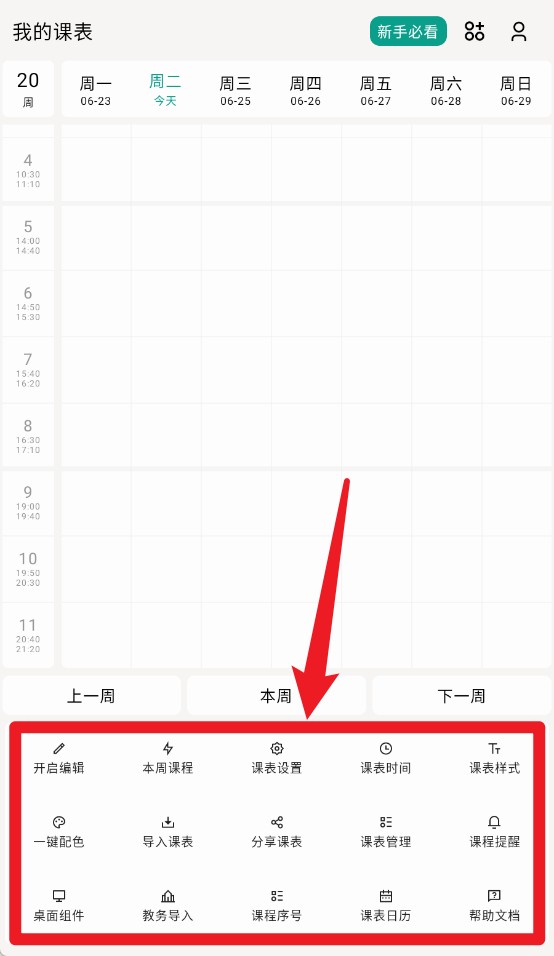 1.课程表主界面可切换查看本周、上周与下周课程,底部提供多种编辑与管理工具选项。