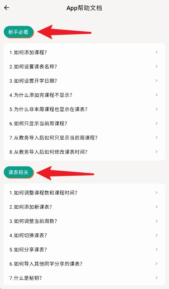 2.App内置“新手必看”和“课表相关”帮助文档,详细解答课程添加与显示异常等常见问题。
